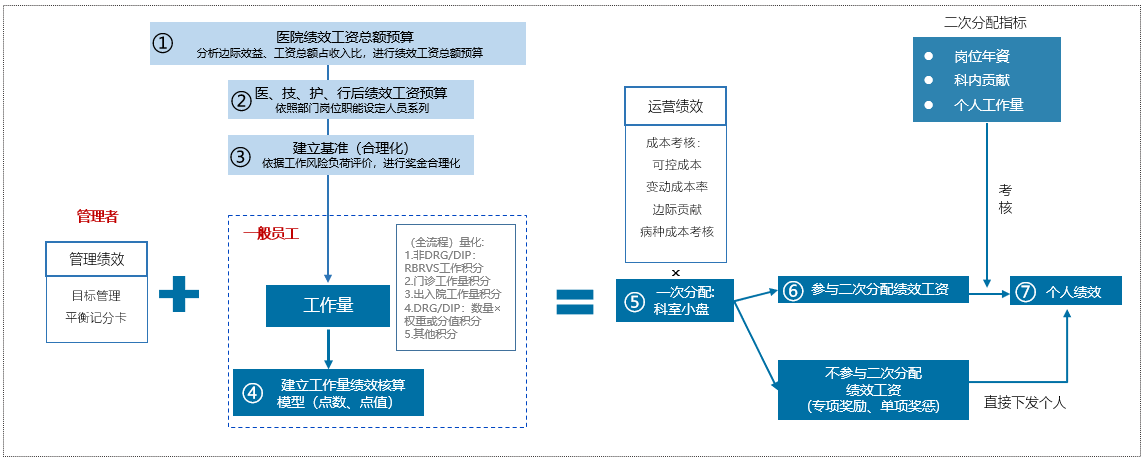 结合运营考核方案,包括前述成本系统的考核方式:如边际贡献考核、安全边际考核、可控成本考核,取得运营考核得分,在RBRVS工作量绩效、DRG/DIP绩效的基础上, 加入运营绩效考核,加强科室成本控制的意识,以降本增效为目的,实现医院战略目标的达成。
