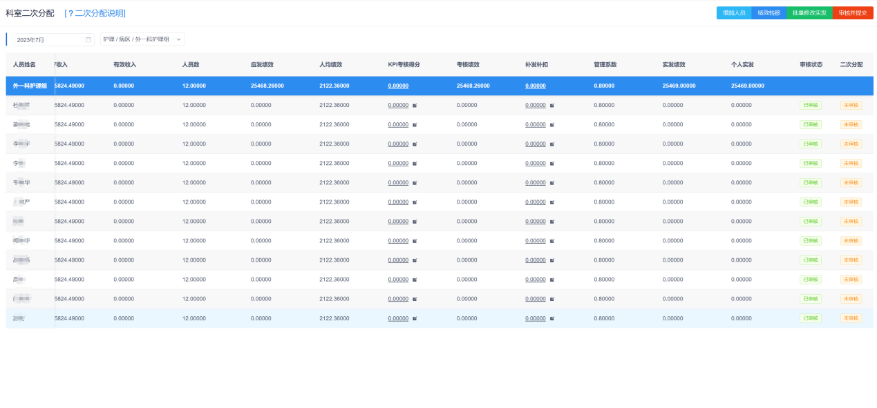 通过二次分配指导方案,将科室绩效进行分配,同时加入二次分配说明帮助科室完成分配,支持补发补扣的灵活调整。