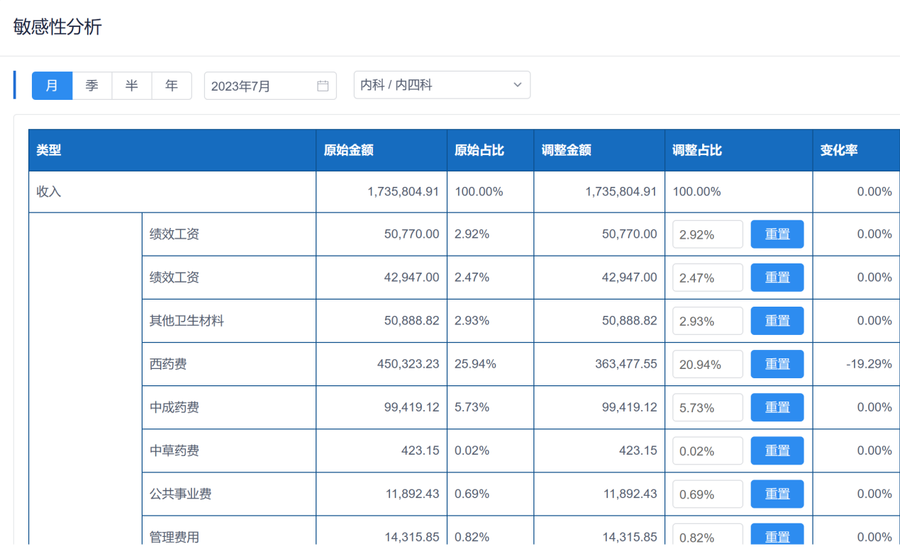 通过调整科室成本中某一个成本项目的占比,快速预测对科室损益、盈亏平衡点、边际贡献、结余的影响程度。