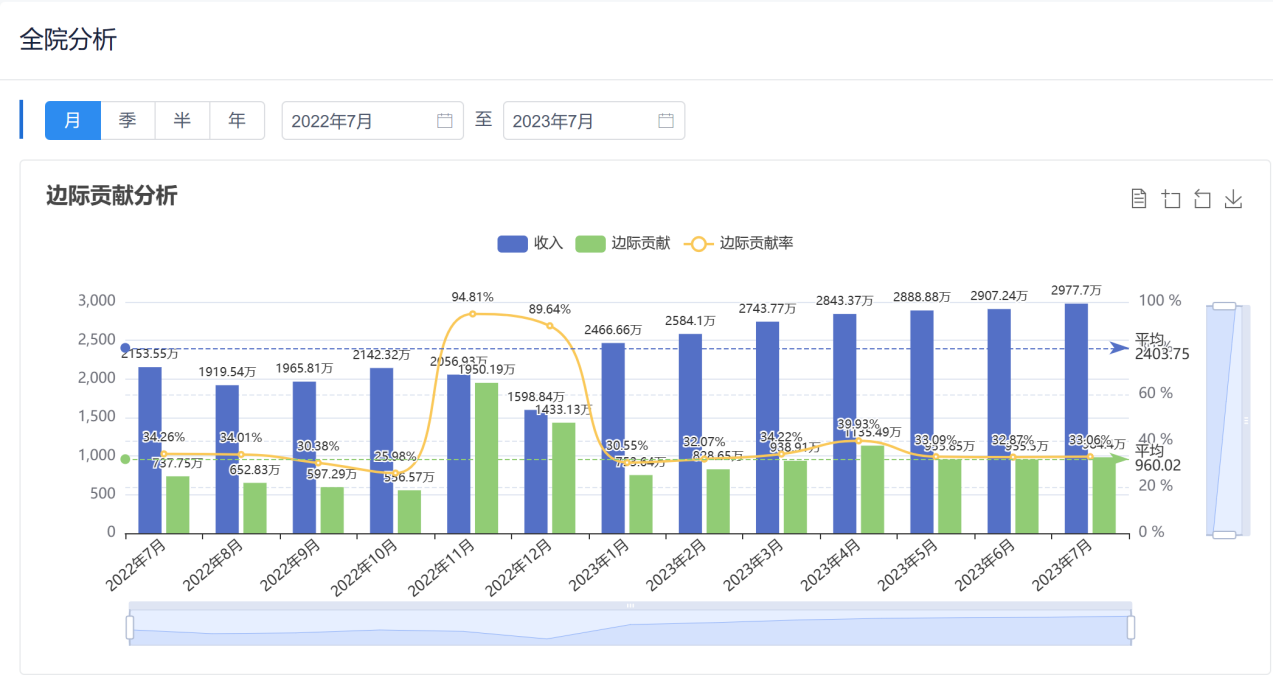 分析科室运营能力,边际贡献越高,可吸收的固定成本越多,科室的盈利能力越强,配合运营考核方案,提升科室运营管理效率,同时为医院整体资源配置提供数据支持。